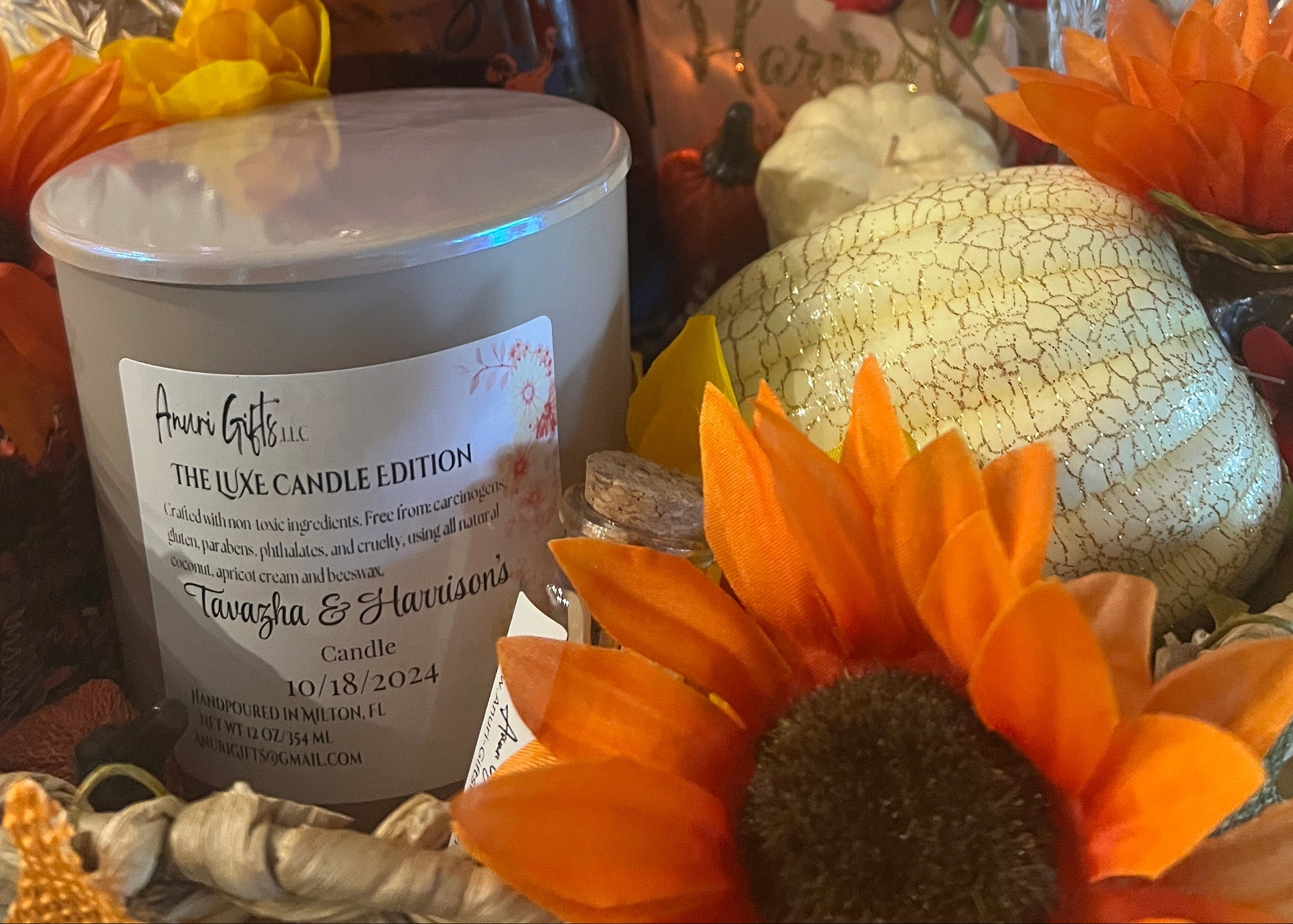 Our Luxe Custom Scented Candle is beautifully decorated with silk flowers (remove before lighting candle) and is placed in a gift box for gift giving. It features a non-toxic formula with a blend of all natural coco-apricot wax. This unique blend not only burns cleaner, with less soot, the fragrances used are all non-toxic, phthalate-free and are our best selling custom scent blends.